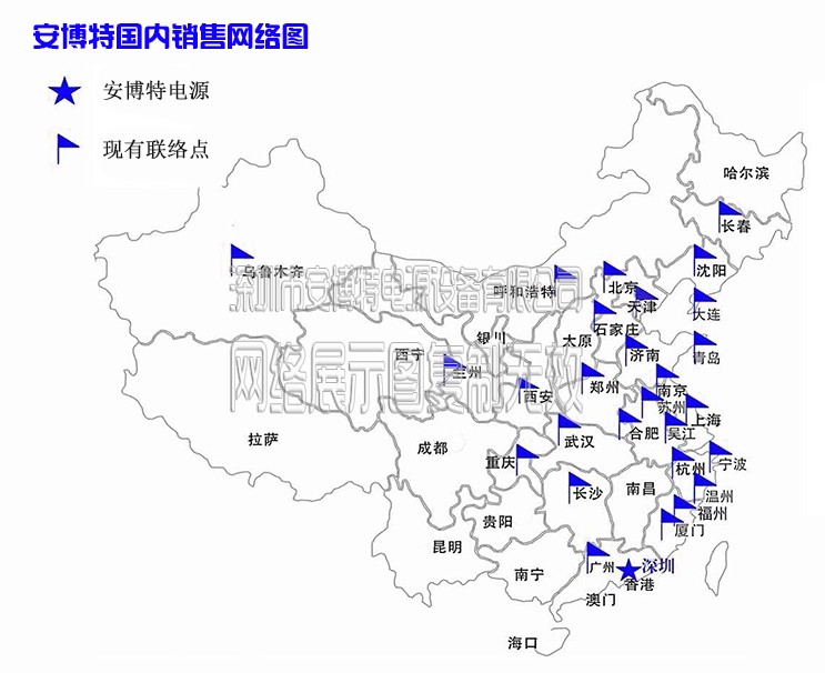 安博特電源擁有十余年的電氣產(chǎn)品研發(fā)和制造經(jīng)驗(yàn),擁有強(qiáng)大研發(fā)團(tuán)隊(duì)和先進(jìn)制造設(shè)備,高新的技術(shù)和大規(guī)模生產(chǎn)模式成為行業(yè)的領(lǐng)先者。安博特電源總部在深圳、銷售覆蓋全國并走向世界,扁平化市場網(wǎng)絡(luò)將使我們不斷擴(kuò)大品牌的影響力,能為企業(yè)提供合理有效的市場拓展計(jì)劃和應(yīng)變策略,并由此建立完善的銷售政策,對(duì)應(yīng)不同區(qū)域加以施行,安博特為了更好的拓展國內(nèi)市場,2005年以來,安博特公司先后組建了北京大區(qū)、東北大區(qū)、中原大區(qū)、華東大區(qū)、華南大區(qū)、西南大區(qū)、福建大區(qū)、華中大區(qū)、西北大區(qū)9個(gè)銷售大區(qū),成立了 北京、長春、上海、重慶、福州、鄭州6個(gè)辦事處。現(xiàn)擁有北京聯(lián)絡(luò)點(diǎn)、天津聯(lián)絡(luò)點(diǎn)、長春聯(lián)絡(luò)點(diǎn)、沈陽聯(lián)絡(luò)點(diǎn)、大連聯(lián)絡(luò)點(diǎn)、哈爾濱聯(lián)絡(luò)點(diǎn)、石家莊聯(lián)絡(luò)點(diǎn)、鄭州聯(lián)絡(luò)點(diǎn)、濟(jì)南聯(lián)絡(luò)點(diǎn)、青島聯(lián)絡(luò)點(diǎn)、山西聯(lián)絡(luò)點(diǎn)、上海聯(lián)絡(luò)點(diǎn)、吳江聯(lián)絡(luò)點(diǎn)、杭州聯(lián)絡(luò)點(diǎn)、溫州聯(lián)絡(luò)點(diǎn)、寧波聯(lián)絡(luò)點(diǎn)、南京聯(lián)絡(luò)點(diǎn)、蘇州聯(lián)絡(luò)點(diǎn)、合肥聯(lián)絡(luò)點(diǎn)、深圳聯(lián)絡(luò)點(diǎn)、中山聯(lián)絡(luò)點(diǎn)、廣西聯(lián)絡(luò)點(diǎn)、重慶聯(lián)絡(luò)點(diǎn)、成都聯(lián)絡(luò)點(diǎn)、昆明聯(lián)絡(luò)點(diǎn)、廈門聯(lián)絡(luò)點(diǎn)、福州聯(lián)絡(luò)點(diǎn)、武漢聯(lián)絡(luò)點(diǎn)、長沙聯(lián)絡(luò)點(diǎn)、西安聯(lián)絡(luò)點(diǎn)、蘭州聯(lián)絡(luò)點(diǎn)、新疆聯(lián)絡(luò)點(diǎn)等28個(gè)聯(lián)絡(luò)點(diǎn)。